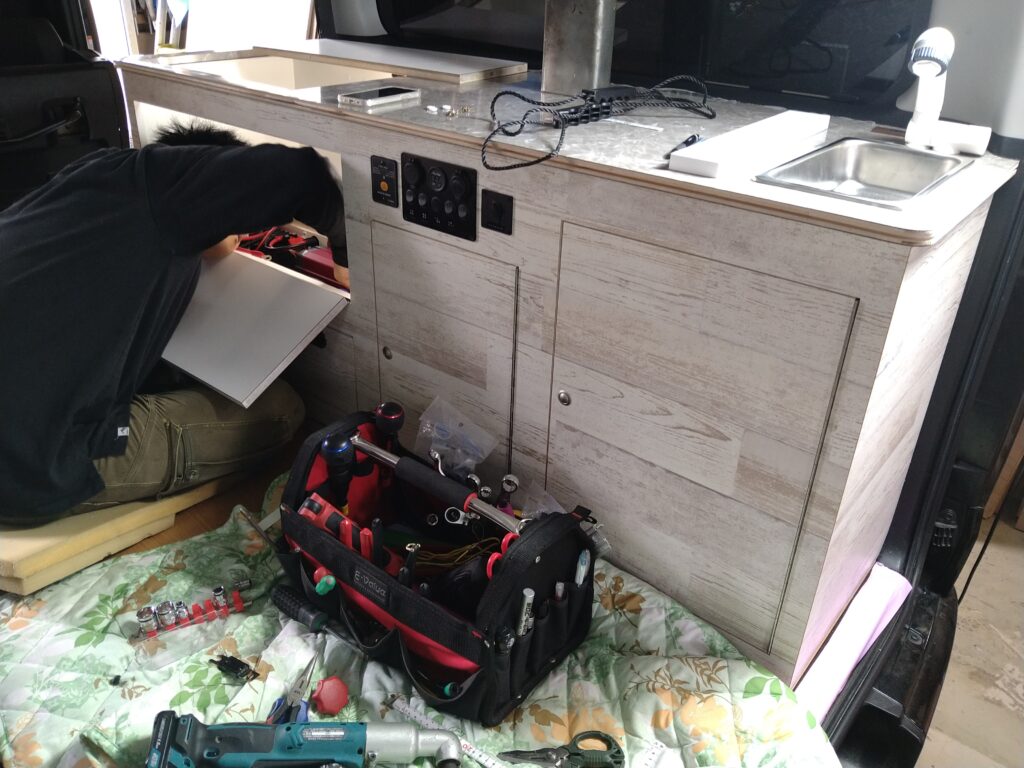 ただいま、家具を取り付けて、電装パーツの配線中。