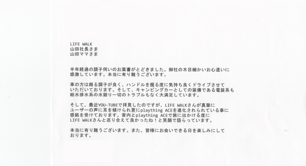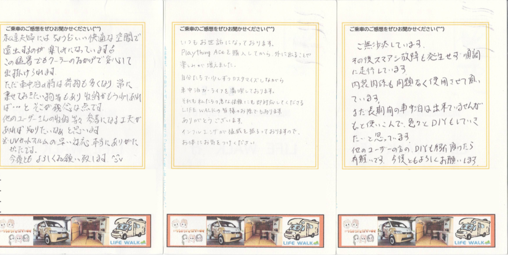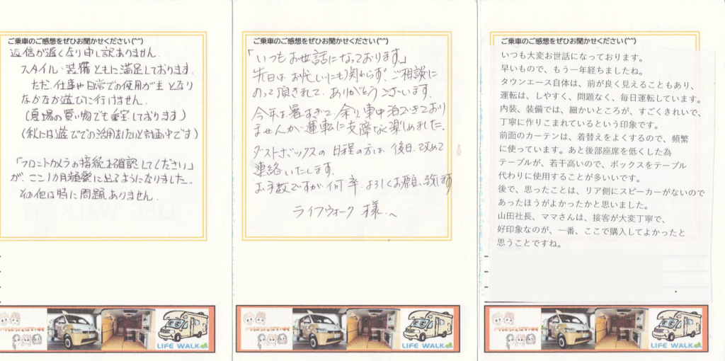 そこでオーナー様に実際にご乗車して使っていただいた感想として、「良かった点」や「残念だった点」などの本音をお聞きしたいと思い、半年と1年後にアフターはがきを出させていただいています。