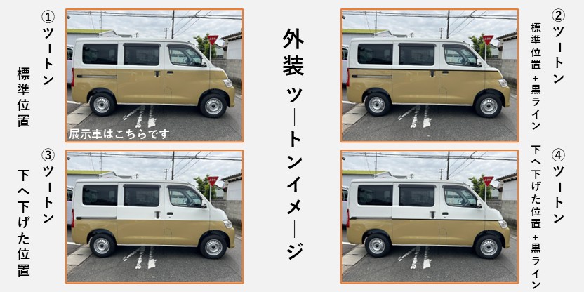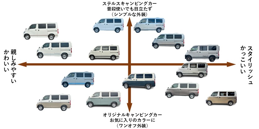 車の外装カラーやデザインは、自分が気に入ったものに乗りたいと思いませんか?(^^)また、車と乗っている人の第一印象を大きく左右する重要なポイントです。中にはなんでも良いと思われる方もおられるかもしれませんが、世界に一つだけのキャンピングカーを作るのですから外装にもこだわってほしいです!