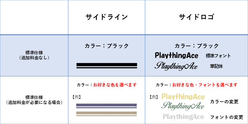 標準仕様としてサイドラインとサイドロゴ(フォント2種類)を選べるように設けています。普段使用もするし、PlaythingAceならではの特別感を出したい方におすすめです★