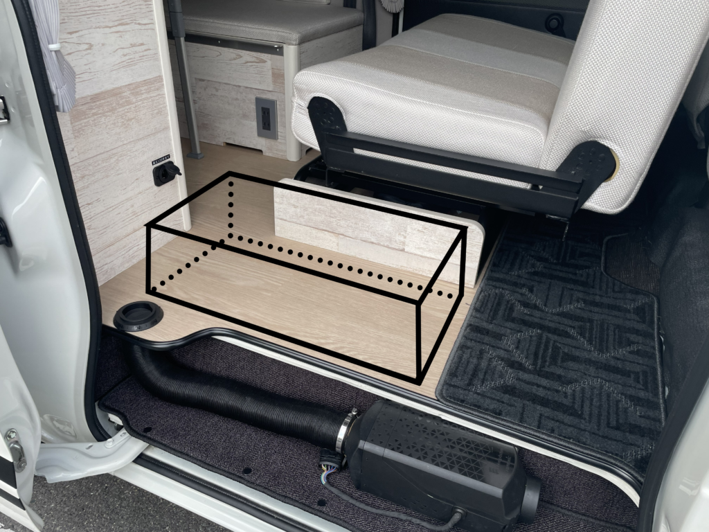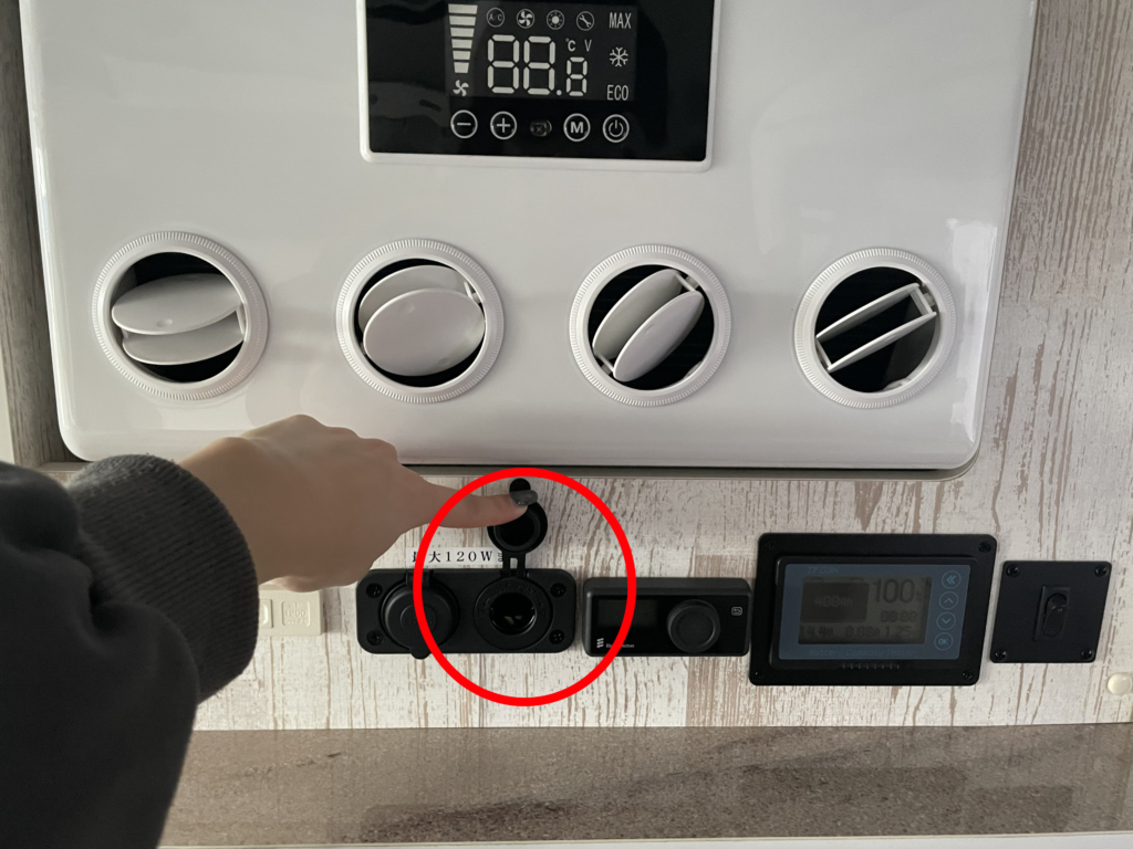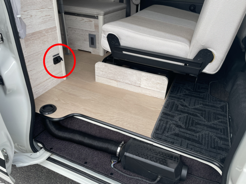 オプションで運転席側キャビネット横に12Vソケットを増設します。こちらはセカンドシード2名用を選んだ方におすすめのオプションで、展示車ではここに置いて使用しています。