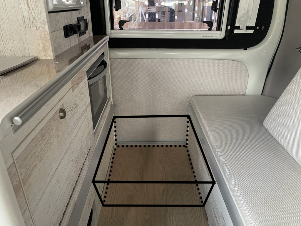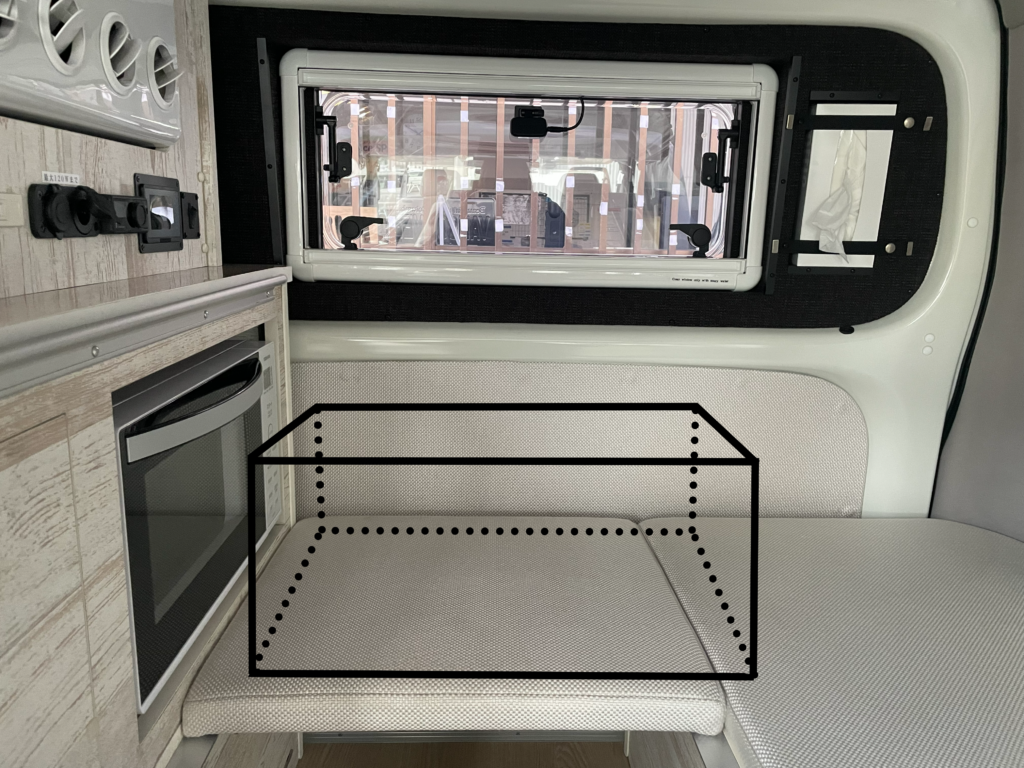 こちらのスペースは冷蔵庫のほかにも物を載せることができる収納スペースになっていますが、気を付けていただきたいポイントが1つあります。ウインドウ用ハンドルとファスプシートの淵が少し飛び出ていることにより、置ける幅が狭くなっていることです。