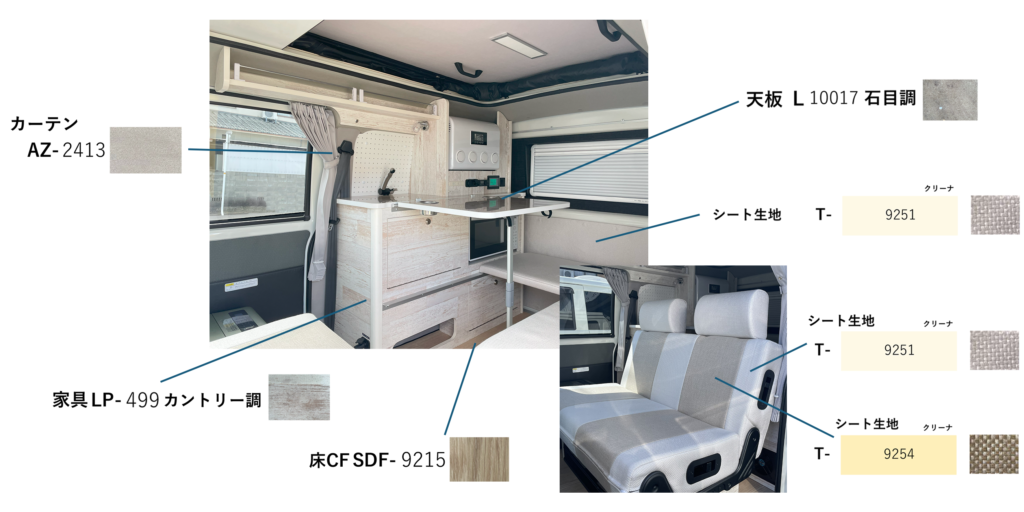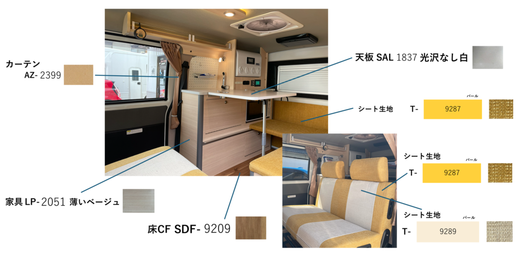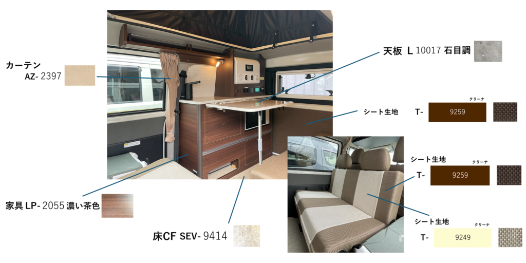 内装(床・家具・天板・シート・カーテン)はサンプルの中からお好きなカラーや柄を選んでいただきます。最終お打ち合わせの日にちが決定いたしましたら、その日から2週間前に内装サンプルセットを送付いたします。約2週間お家でゆっくりお悩みください。(お届け日が前後することがあります)