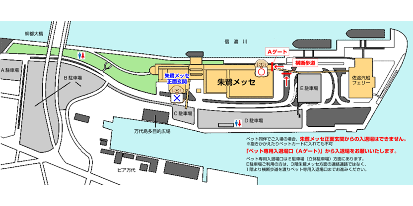 ペット同伴でご入場の場合、朱鷺メッセ正面玄関からの入退場はできません。(抱きかかえている、ペットカートを使用の場合でも不可)ペット同伴のお客様はペット専用の入り口を設けております。そちらからご入場をお願いいたします。朱鷺メッセの共用部ではペットの同伴は禁止です。